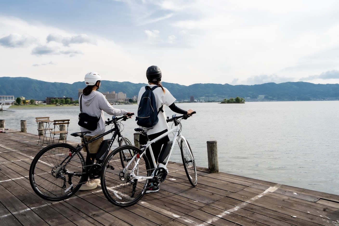 その一つは、スタイリッシュなEバイクによる周辺観光。1周16キロの諏訪湖はアップダウンの少ない平坦な入門コース。2023年度中には湖を一周するサイクリングロードも完成する予定。盆地である諏訪はEバイクでのレジャーに最適だ。