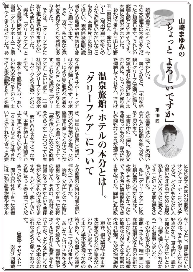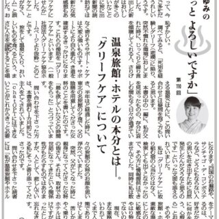 苦しかったコロナ禍をようやく乗り越えて、温泉旅館やホテルはこれから巻き返すわけですが、どんなに忙しくなったとしても、その本分をお忘れなきようと願っております。