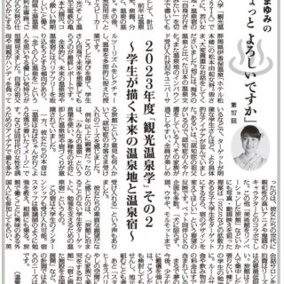 跡見学園女子大学「観光温泉学」(履修生221人)では、最終レポートに、若い女性の感性で温泉地・温泉宿の未来像について「自身が行きたい、運営してみたい」を切り口に800文字で書いてもらいます。