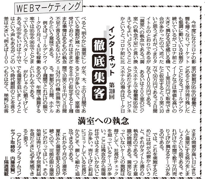 これから7月の3連休や夏休みと満室を狙える日が続くので、可能な限り満室にこだわってほしい。その効果は売り上げや営業利益を見たときに必ず実感できると思う。