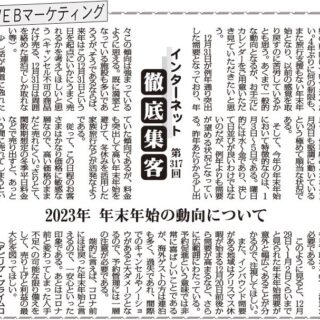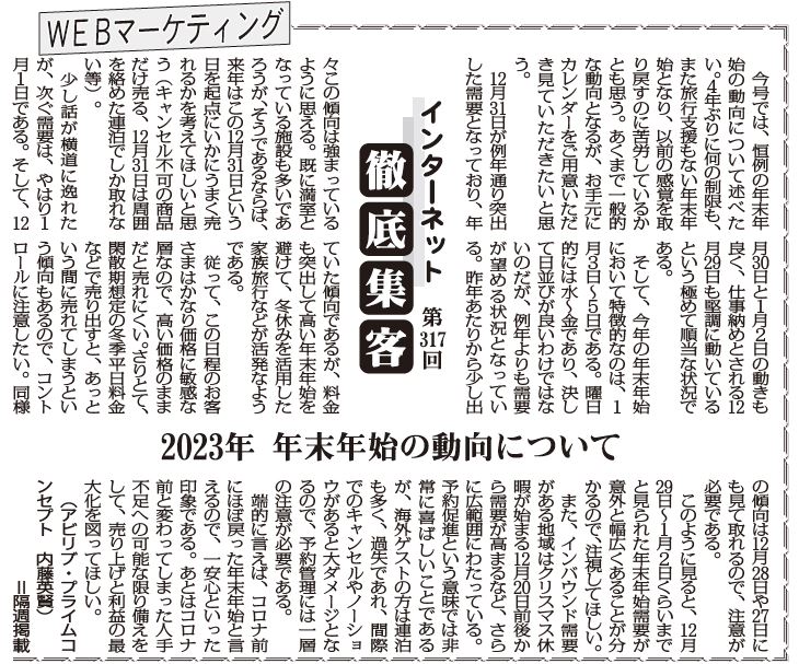 今号では、恒例の年末年始の動向について述べたい。4年ぶりに何の制限も、また旅行支援もない年末年始となり、以前の感覚を取り戻すのに苦労しているかとも思う。あくまで一般的な動向となるが、お手元にカレンダーをご用意いただき見ていただきたいと思う。