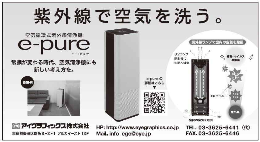 紫外線照射装置のパイオニア、アイグラフィックス(東京都墨田区)。これまで培った技術を水平応用(他分野への応用)し、空気循環式紫外線清浄機「e―pure(イーピュア)」を今年1月に発売。コロナ禍において、その技術で空間環境改善に応えている。