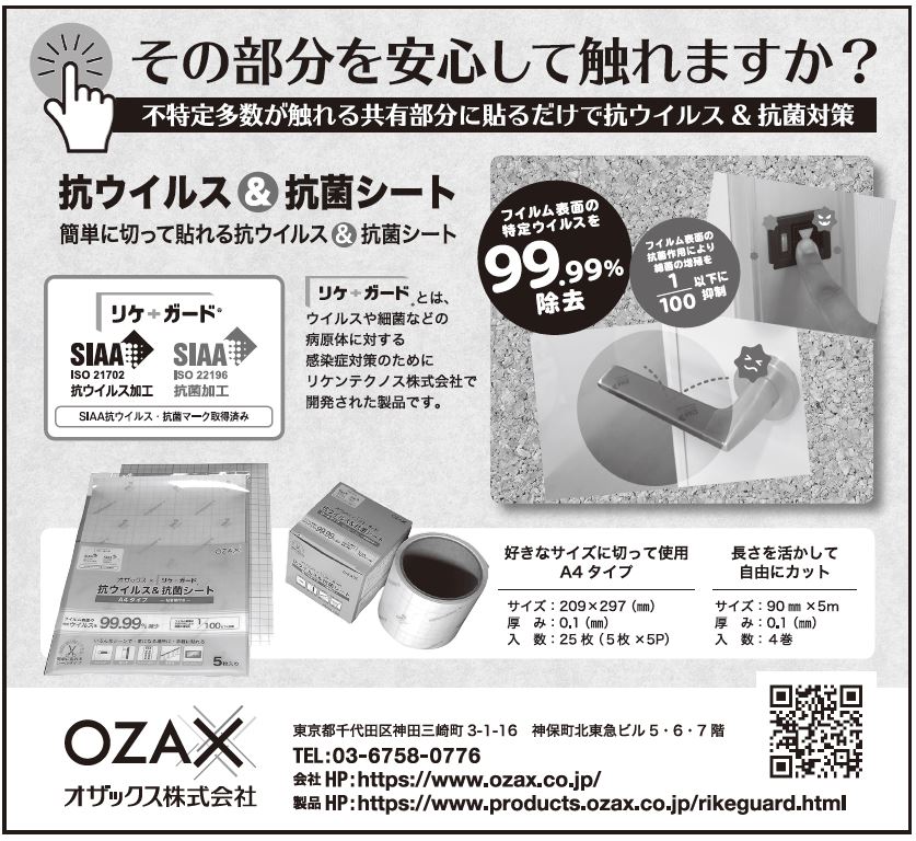 明治時代末期の1910年創業の商社、オザックス(東京都千代田区)。同社では昨年9月から、大手化学メーカーのリケンテクノスが開発した素材を使い、製品化した「オザックス×リケ+ガード 抗ウイルス&抗菌シート」を販売し、活用を呼び掛けている。