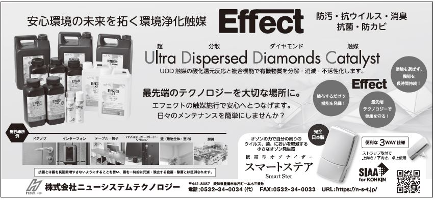 エフェクトとは、UDD触媒(超分散ダイヤモンド触媒)の酸化還元反応と複合機能で、ウイルス、菌、悪臭、カビなどの有害物質を分解、消滅、不活化する。特殊製法が施されたことで、科学的に安定し、「光や温度の影響を受けることなく、安定した効果を長時間発揮し、人体への安全性も確保している。消臭率は48時間後に99%、防カビ試験でも14日間後に100%の効果が認められ、シックハウス症候群などのアレルギー対策にも効果を発揮する」と統括部長の吉田晋悟氏。
