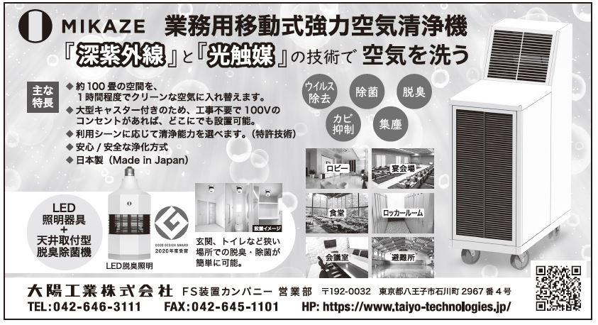 同社では5月、MIKAZEから業務用の移動式空気清浄機「MKZ―MLシリーズ」を発売。大型キャスター付きのため、100ボルトのコンセントがあれば、工事不要でどこにでも設置可能。