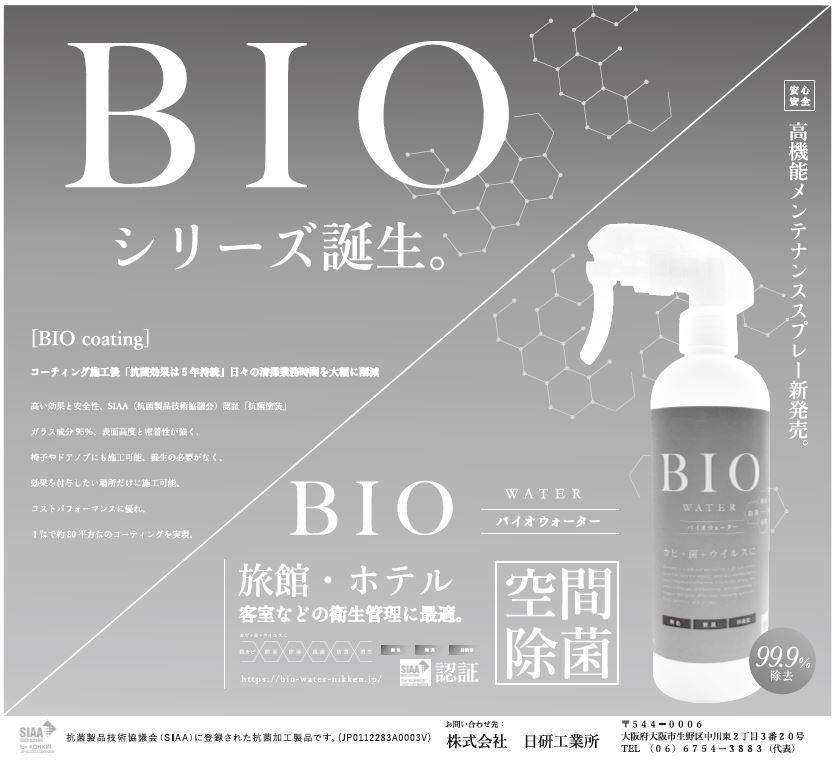 1950年創業で、吹付塗装を主体とした精密・工業塗装を行う日研工業所(大阪市)は、抗菌・抗ウイルス・防カビ効果を持つ「バイオコーティング・バイオウォーター」の施工、販売を強化している。