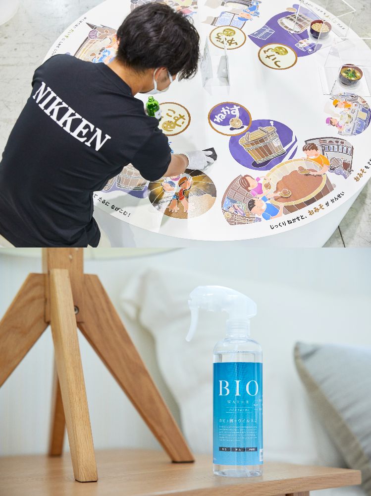 また、バイオコーティングの施工後に使うメンテナンス剤として開発されたスプレータイプのバイオウォーターを使って、「万全の態勢で宿泊客を迎えてほしい」と話す。