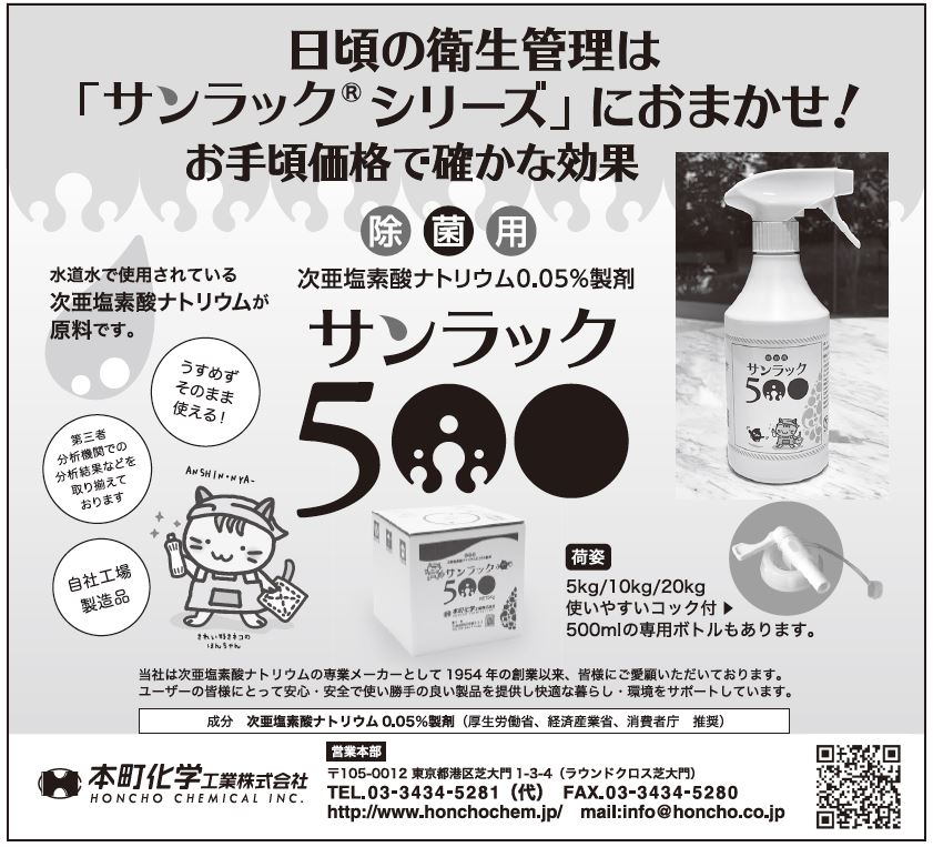 同社は昨今の新しい生活様式に適応した除菌剤「サンラック500」を上市した。大手ホテルチェーンをはじめとする宿泊施設や医療機関、各種学校、養護施設、飲食店などに導入実績がある。