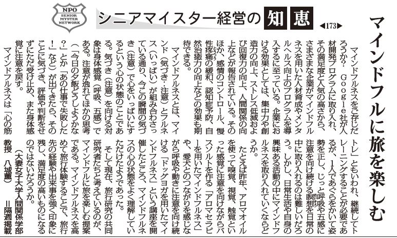 そして現在、旅行研究の共同研究者たちと考えているのが、マインドフルに旅を楽しむ提案である。マインドフルネスを高めて旅行体験することで、旅行先の経験や出来事を強く印象に残し、満足度の高いものになるのではないだろうか。