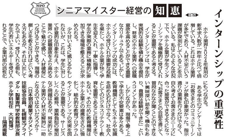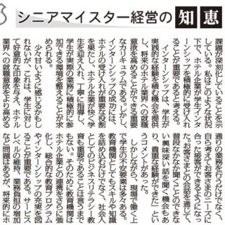 【シニアマイスター経営の知恵 176】インターンシップの重要性  札幌観光ブライダル・製菓専門学校 教務部次長ホテル学科担当 大内智博