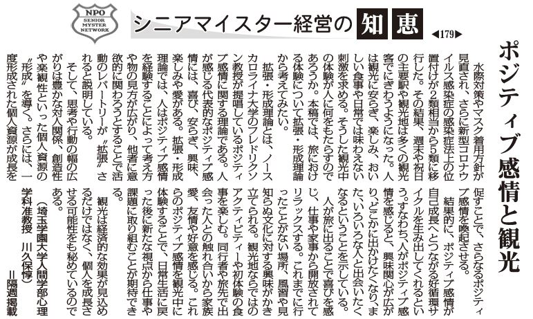 水際対策やマスク着用方針が見直され、さらに新型コロナウイルス感染症の感染症法上の位置付けが2類相当から5類に移行した。その結果、週末や祝日の主要駅や観光地は多くの観光客でにぎわうようになった。人は観光に安らぎ、楽しみ、おいしい食事や日常では味わえない刺激を求める。そうした観光中の体験が人に何をもたらすのであろうか。本稿では、旅における体験について拡張・形成理論から考えてみたい。
