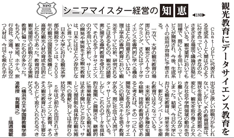 【シニアマイスター経営の知恵 180】観光教育にデータサイエンス教育を 横浜市立大学国際教養学部 准教授 有馬貴之