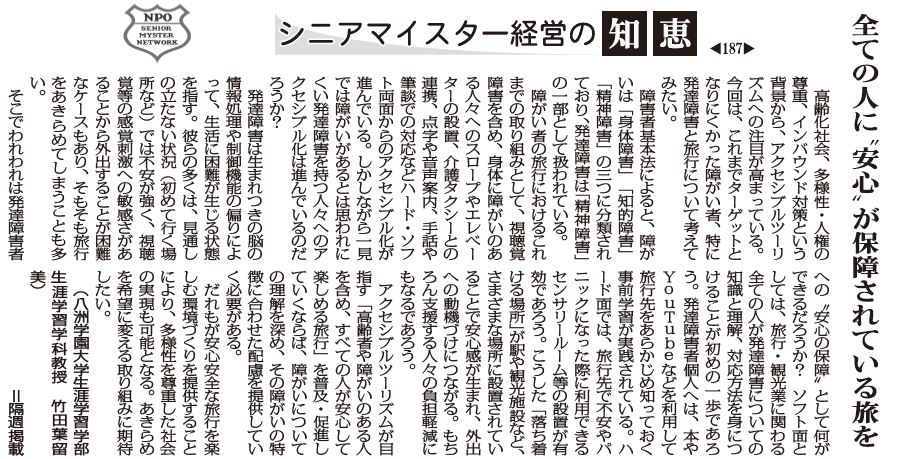 高齢化社会、多様性・人権の尊重、インバウンド対策という背景から、アクセシブルツーリズムへの注目が高まっている。今回は、これまでターゲットとなりにくかった障がい者、特に発達障害と旅行について考えてみたい。