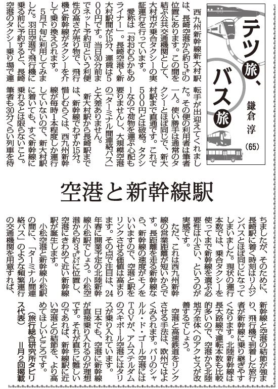 愛称は「おおむらかもめライナー」。長崎空港~新大村駅間が15分、運賃は500円です。当日30分前までネット予約可という利便性の高さが売り物で、飛行機と新幹線がタクシーを介して乗り換えられます。