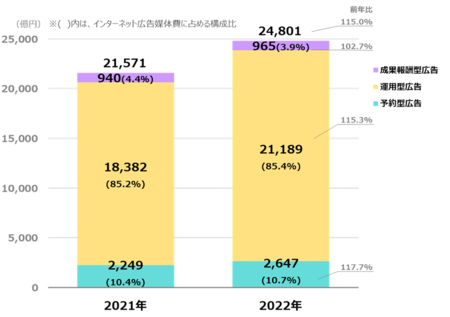 予約型広告は前年比117.7%、成果報酬型広告は前年比102.7%といずれも成長した。