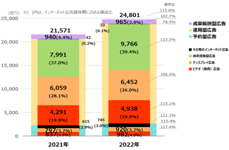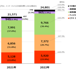2022年のインターネット広告媒体費は、2兆4,801億円(前年比115.0%)(電通「2022年 日本の広告費」より)。インターネット広告媒体費を広告種別で見ると、「検索連動型広告」が前年比122.2%の9,766億円と高い成長率となり、構成比でも39.4%まで伸長した。「ビデオ(動画)広告」は前年比115.4%の5,920億円、構成比は23.9%となった。【グラフ1】