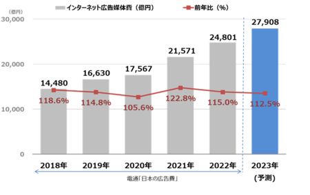 ~2023年のインターネット広告媒体費は総額で2兆7,908億円(前年比112.5%)になると予測~