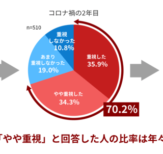 その結果、宿泊を検討した方のうち、「重視した」と「やや重視した」の合算はコロナ禍1年目で72.7%、2年目は70.2%、3年目は60.2%でした。コロナ禍を通して高い水準であったものの、重視する度合いは年々、低下傾向にあることが分かりました。