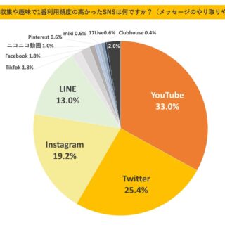 全国の10代~60代の男女を対象とした「2022年に、情報収集や趣味で1番利用頻度の高かったSNSは何ですか?」というアンケートを行ったところ、最も多かった回答は「YouTube」で33.0%という結果になりました。次いで、「Twitter」が25.4%、「Instagram」が19.2%、「LINE」が13.0%と続きました。