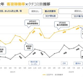 日本国内宿泊施設の「客室稼働率」、「クチコミ数」と「クチコミスコア」の推移(2021年〜2022年)