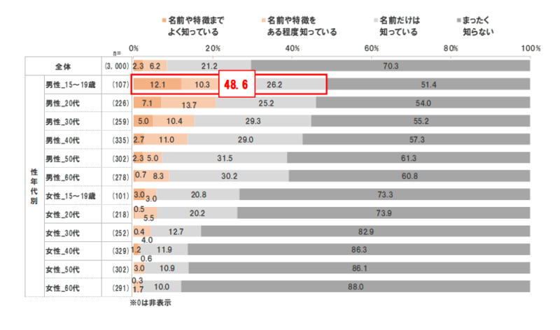 また、web3の認知率は15~19歳の男性が最も高く、約半数(48.6%)が認知していることが分かった(「名前や特徴までよく知っている」(12.1%)、「ある程度知っている」(10.3%)、「名前だけは知っている」(26.2%)の合計)。【図表2】