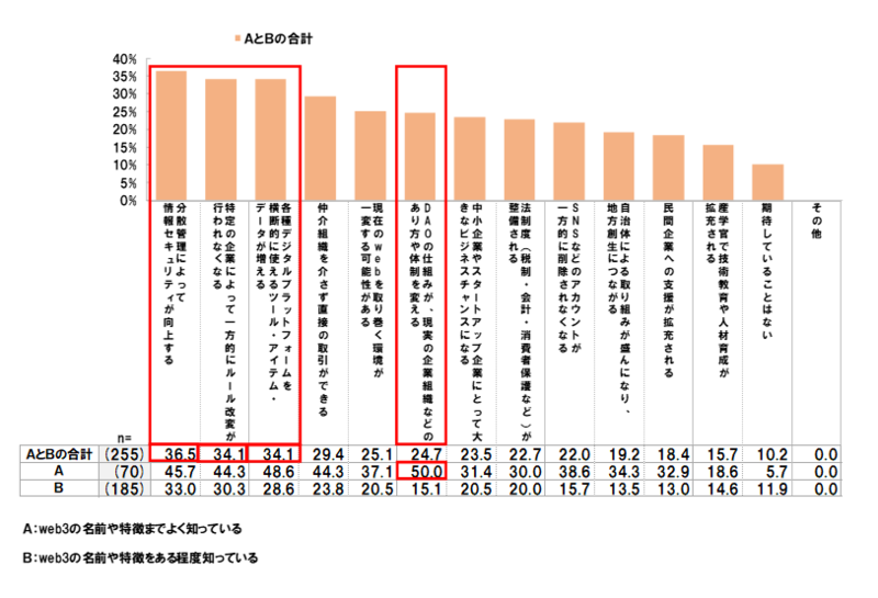 ②web3への期待は、「情報セキュリティの向上」「一方的なルール改変の防止」「プラットフォーム横断でのツール利用」。web3をよく知っている人は、「DAO(分散型自立組織)」への期待値が高い。