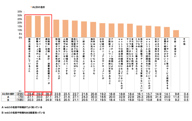 web3について「名前や特徴までよく知っている」「名前や特徴をある程度知っている」と回答した人がweb3について不安や不満に思っていることは、「国民の理解が不足していること」(29.4%)、「サイバー攻撃による情報セキュリティへの不安があること」(29.0%)、「法制度(税制・会計・消費者保護など)が遅れていること」(28.2%)などが高い。【図表4】