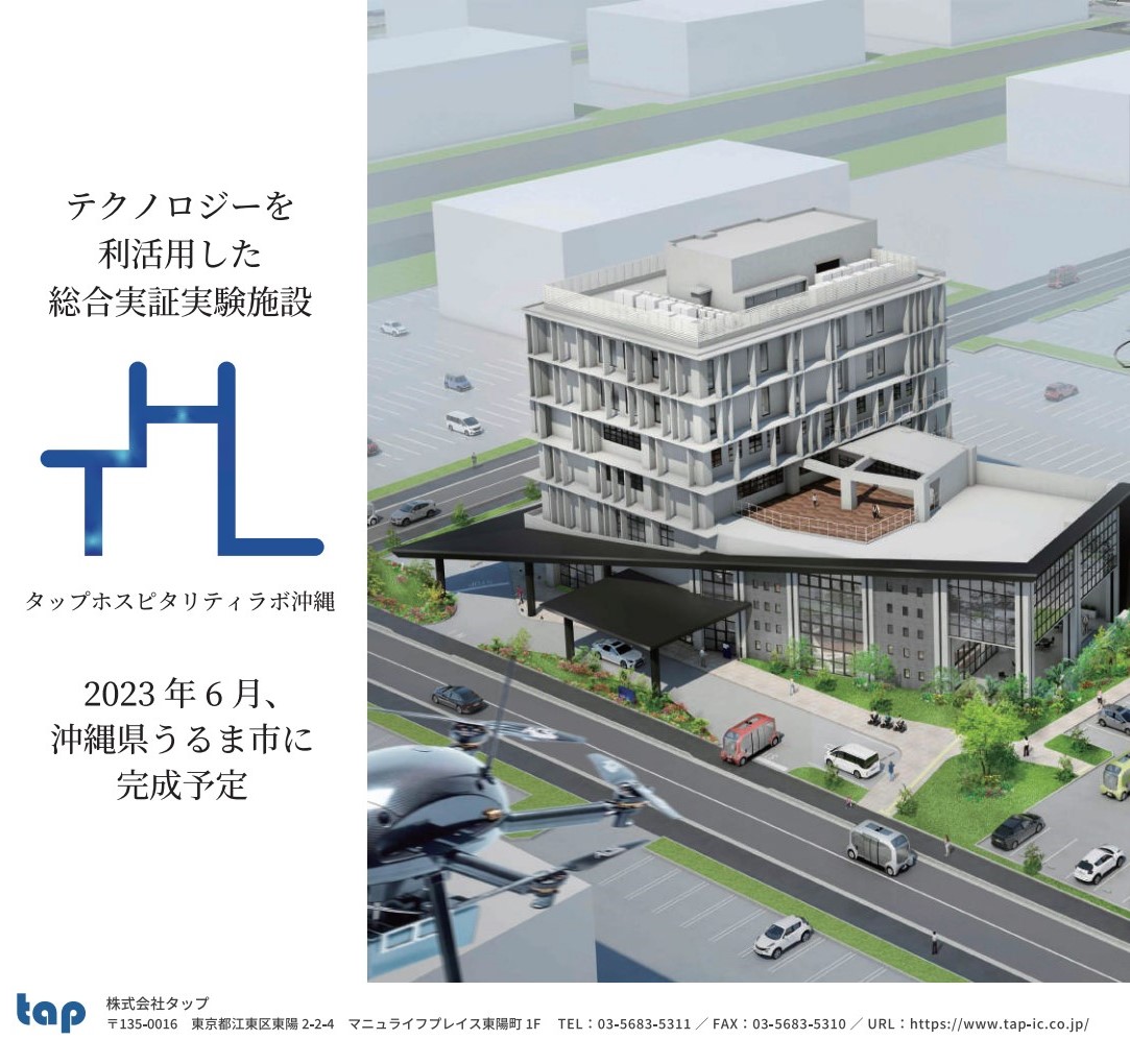 HCJ2023の同社ブースでは、6月に沖縄県うるま市に開設する実証実験ホテル「タップホスピタリティラボ沖縄(以下、THL)」のデモを行う。THLは地上7階建て、総客室数38室。沖縄県が国内外の情報通信関連産業の一大拠点となるために進めているビッグプロジェクト「沖縄IT津梁パーク」内に新築し、現在開設準備を進めている。
