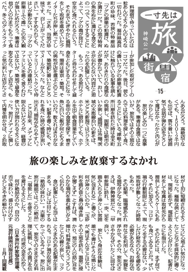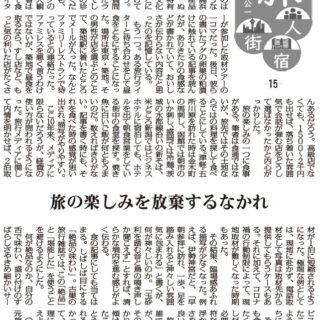 旅という身近な体験は、誰でも書けそうな感じだが、実はそんなことはない。その土地を訪れ、温泉に浸かり、地元の人の話に耳を傾け、料理を味わう。こうしたことの繰り返しで、コクとうまみのある記事が生まれる。コロナ禍が収束に向かっている今こそ、旅に出て、旅先でのさまざまな料理に挑戦し、その喜びを伝えよう。自戒の念を込めて。