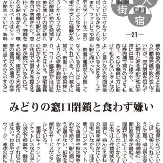 こうしたセルフ方式は人件費の削減に効力を発揮する。旅に関しての話に移れば、自宅の最寄り駅のみどりの窓口が閉鎖された。窓口に行ってみると、閉鎖を知らせる貼り紙があり、職員がいたスペースはシャッターが閉まっていた。新幹線や特急の指定券などを扱う自動券売機が数台並んでいたが、窓口閉鎖を知らずに訪れたある年配女性は非常に戸惑った様子で、「私は券売機で買うのはどうも苦手。やはり職員の方に助けてもらわないとダメなのよ」と言いながら対面営業をしている大きなターミナル駅に向かった。