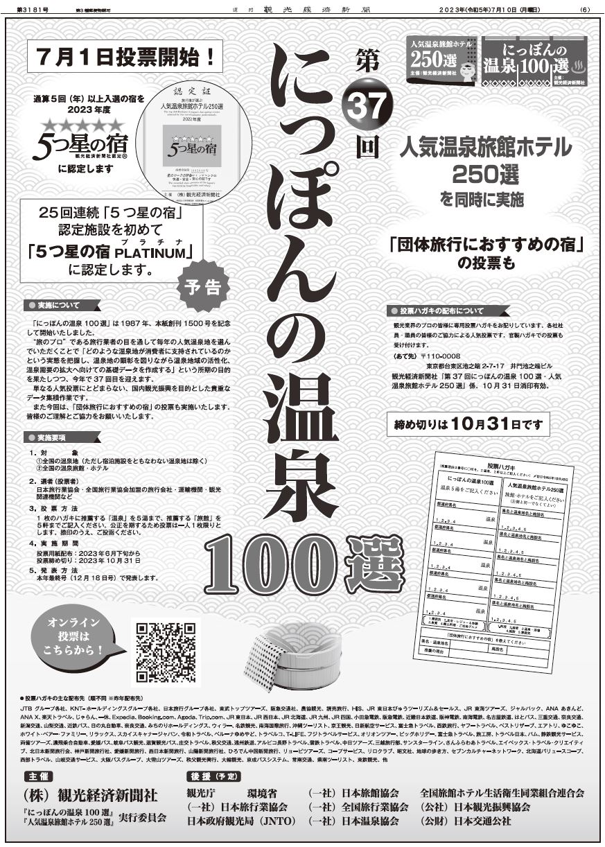 第37回「にっぽんの温泉100選」「人気温泉旅館ホテル250選」投票開始!