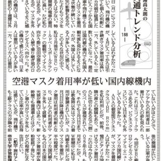 3月13日(月)にマスク着用について、飛行機の機内においても個人の判断になって1カ月弱が経過したが、4月に入ってからも国内では電車や飛行機でも8割以上の人はマスクを着用している状態が続いている。花粉症の影響もあるが、思っていたよりもマスクを外している人は少ない。特に通勤時間帯の電車の着用率はさらに高い。ただ私の肌感覚ではあるが、少しずつではあるが、マスクを外す人が増えているように感じている。