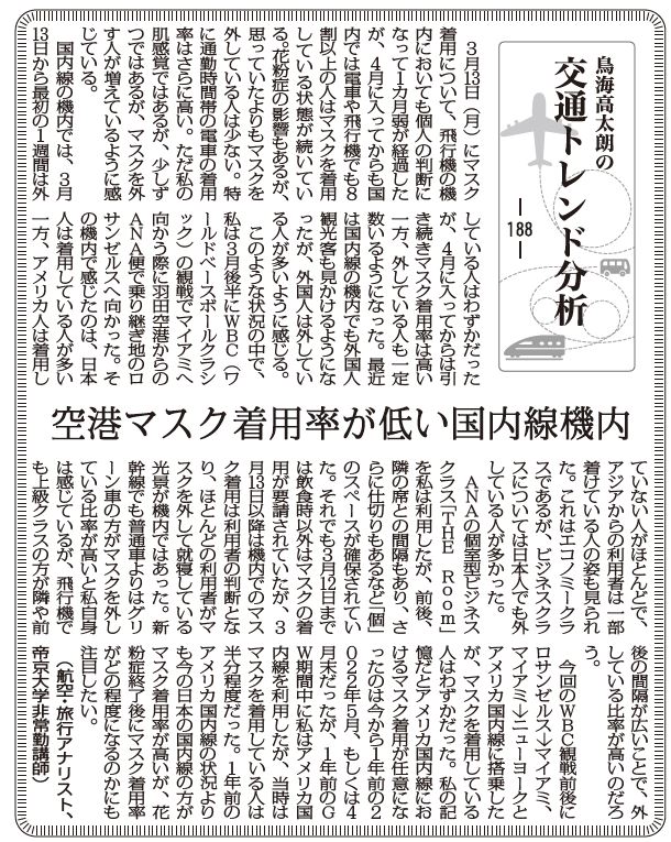 このような状況の中で、私は3月後半にWBC(ワールドベースボールクラシック)の観戦でマイアミへ向かう際に羽田空港からのANA便で乗り継ぎ地のロサンゼルスへ向かった。その機内で感じたのは、日本人は着用している人が多い一方、アメリカ人は着用していない人がほとんどで、アジアからの利用者は一部着けている人の姿も見られた。これはエコノミークラスであるが、ビジネスクラスについては日本人でも外している人が多かった。