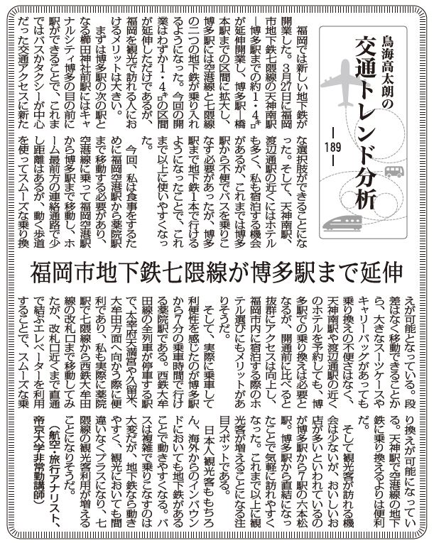 福岡では新しい地下鉄が開業した。3月27日に福岡市地下鉄七隈線の天神南駅―博多駅までの約1.4キロが延伸開業し、博多駅―橋本駅までの区間に拡大し、博多駅には空港線と七隈線の二つの地下鉄が乗り入れるようになった。今回の開業はわずか1.4キロの区間が延伸しただけであるが、福岡を観光で訪れる人におけるメリットは大きい。