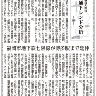 福岡では新しい地下鉄が開業した。3月27日に福岡市地下鉄七隈線の天神南駅―博多駅までの約1.4キロが延伸開業し、博多駅―橋本駅までの区間に拡大し、博多駅には空港線と七隈線の二つの地下鉄が乗り入れるようになった。今回の開業はわずか1.4キロの区間が延伸しただけであるが、福岡を観光で訪れる人におけるメリットは大きい。