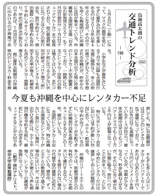 小学生などが夏休みに入る7月下旬以降も全国旅行支援に関係なく、多くの旅行客でにぎわうことが予想される沖縄だが、昨年から日本全国の中でも特に沖縄のレンタカー不足が顕著となっており、一時期に比べるとレンタカー自体の台数は増えてはいるが、まだコロナ前に比べると少ない状況が続き、コロナ禍で「密」にならないレンタカーを利用する比率が増え、利便性も含めてレンタカー需要は増えている。