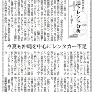 小学生などが夏休みに入る7月下旬以降も全国旅行支援に関係なく、多くの旅行客でにぎわうことが予想される沖縄だが、昨年から日本全国の中でも特に沖縄のレンタカー不足が顕著となっており、一時期に比べるとレンタカー自体の台数は増えてはいるが、まだコロナ前に比べると少ない状況が続き、コロナ禍で「密」にならないレンタカーを利用する比率が増え、利便性も含めてレンタカー需要は増えている。