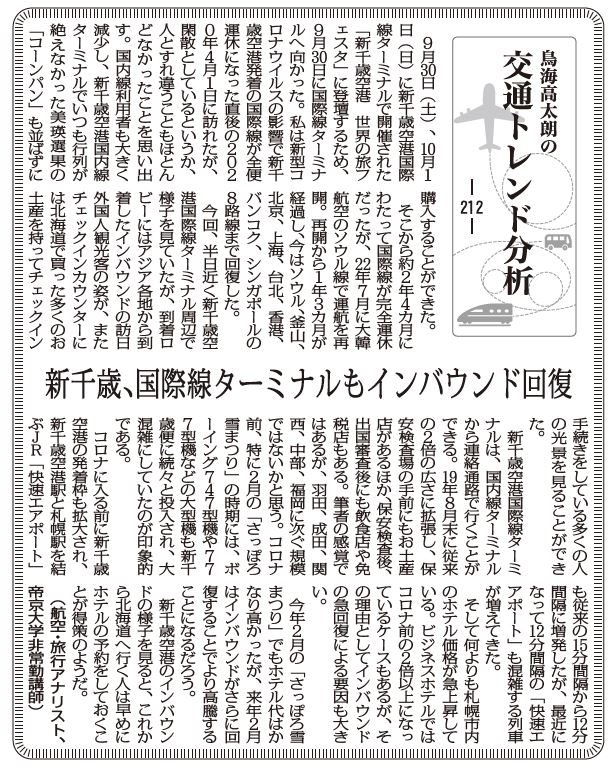 今回、半日近く新千歳空港国際線ターミナル周辺で様子を見ていたが、到着ロビーにはアジア各地から到着したインバウンドの訪日外国人観光客の姿が、またチェックインカウンターには北海道で買った多くのお土産を持ってチェックイン手続きをしている多くの人の光景を見ることができた。