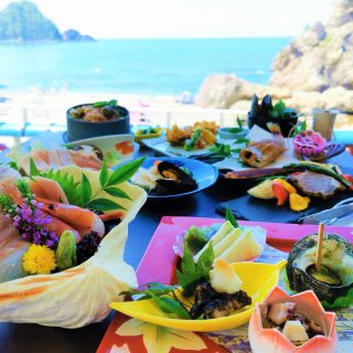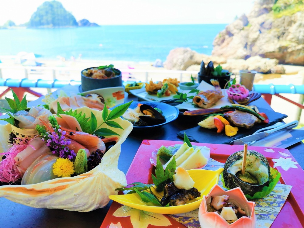 景色もさることながら、宿泊客の胃袋を満たすのが料理だ。車で約5分の場所にある由良漁港から毎日直送される新鮮な魚介類を使用した、日本海の旬を堪能できる和食膳は絶品。