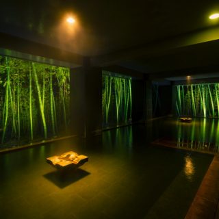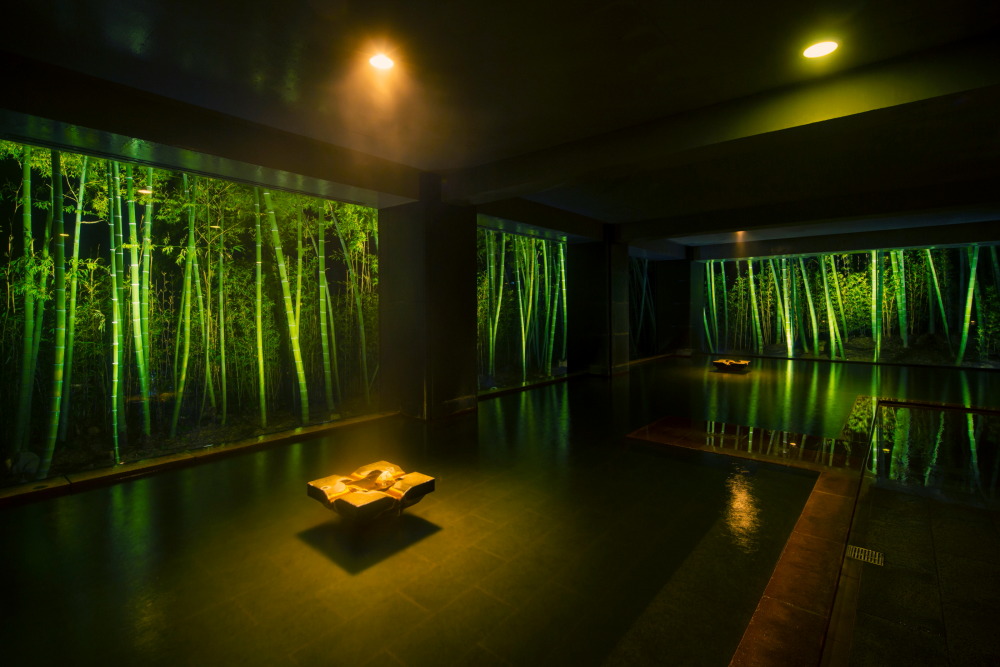 一番のお薦めは宿泊者だけに開かれた湯空間「まほろばの湯場」。窓一面にモウソウダケが迫る「竹林の湯」、ヒノキの香りと温かさに包まれる「双檜の湯」、川のせせらぎが楽しめる「渓流の湯」の三つの風呂がある。