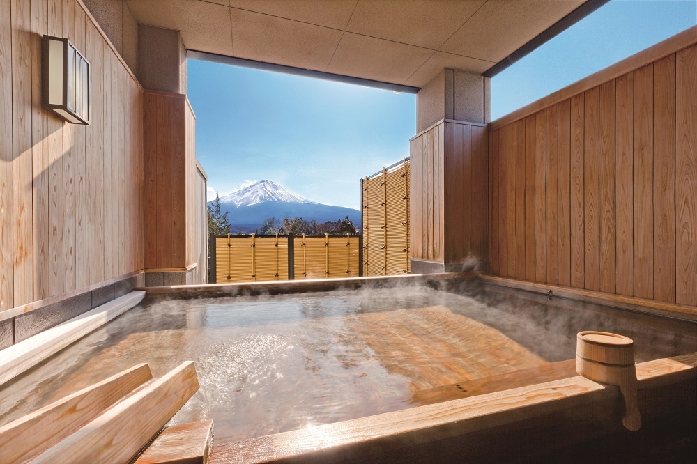 露天風呂、大浴場の四つの湯処は、男女入れ替え制により1泊ですべてを楽しめる。また、貸し切り展望風呂の「芙蓉の湯」は、遮るもののない富士山の眺めを湯船から独り占めできる。