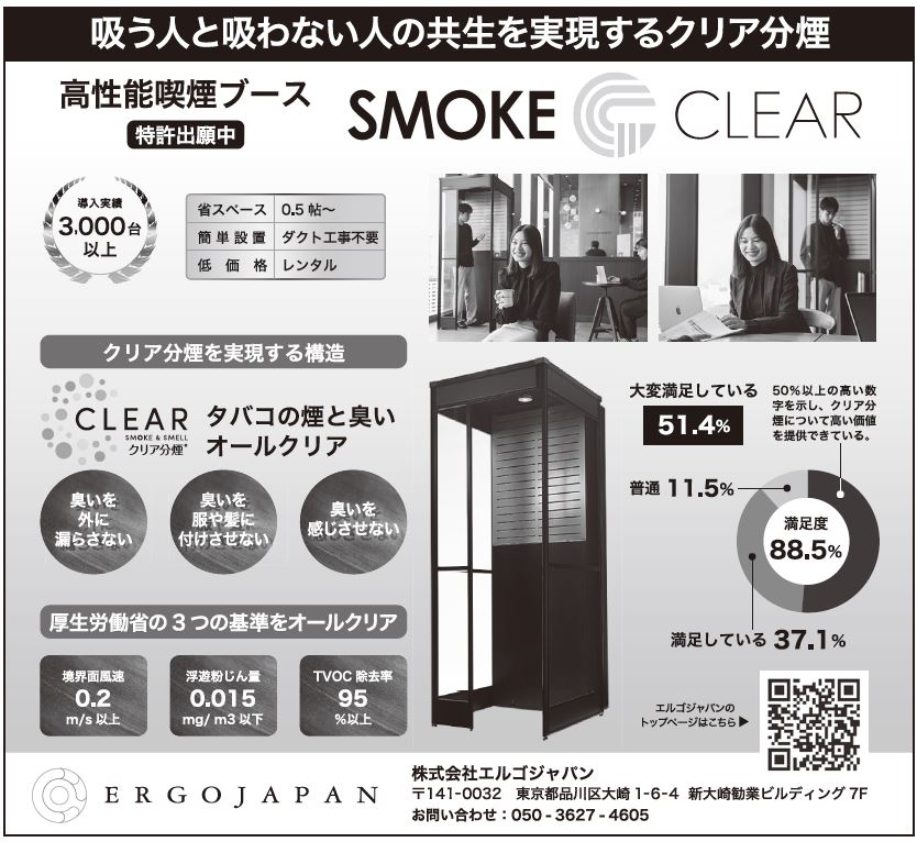 エルゴジャパンが開発した高性能喫煙ブース「SMOKE CLEAR(スモーククリア)」は、飲食店を中心に支持を集め、業界最多クラスの3千台以上の導入実績を誇る。