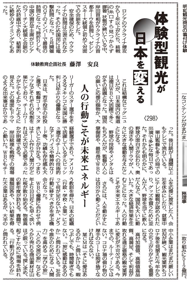 WBC優勝に合わせて例年より10日近くも早く咲いた桜が散り始める。物価高の新年度が訪れる。春闘で満額回答や、いい結果を得た大企業はあるが、大半の中小企業はまだまだ厳しい状況が続く。観光業界もコロナ後を見据えた今年からの立ち上がりがとても重要になる。