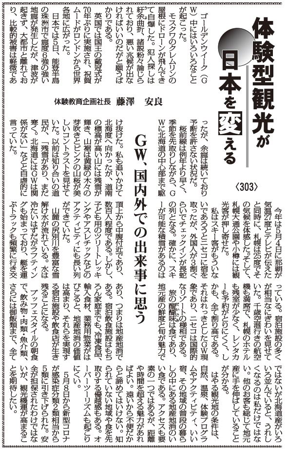 5月8日から新型コロナが感染症分類2類相当から5類に引き下げられた。安全が担保されたわけではないが、観光機運が高まることを期待したい。