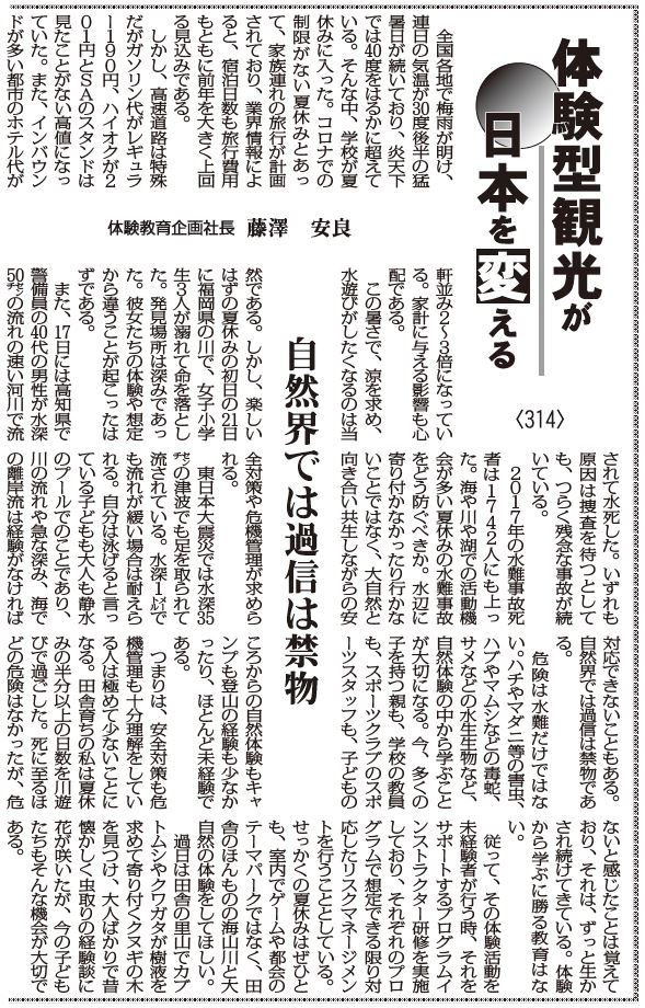 この暑さで、涼を求め、水遊びがしたくなるのは当然である。しかし、楽しいはずの夏休みの初日の21日に福岡県の川で、女子小学生3人が溺れて命を落とした。発見場所は深みであった。彼女たちの体験や想定から違うことが起こったはずである。