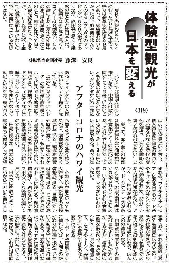 現地の日系ランドオペレーターの支店長は航空機とホテルはネットで容易に予約ができ、現地でのアウトドアアクティビティなど体験プログラムやレンタカー等、スマホを使いこなして動いているため、観光バスはほとんど見ないと言う。個人客は旅行会社の関わりが必要ないなどと時代の変化を嘆き、「次なる戦略を考えなければならない」とも。