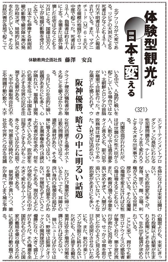 暗いニュースばかりではない。野球では阪神とオリックスの関西球団のリーグ優勝になり、大きく盛り上がりそうだ。その機運を全国的なものとして、この国家の難局を乗り越えるために必要なのは行動の質である。