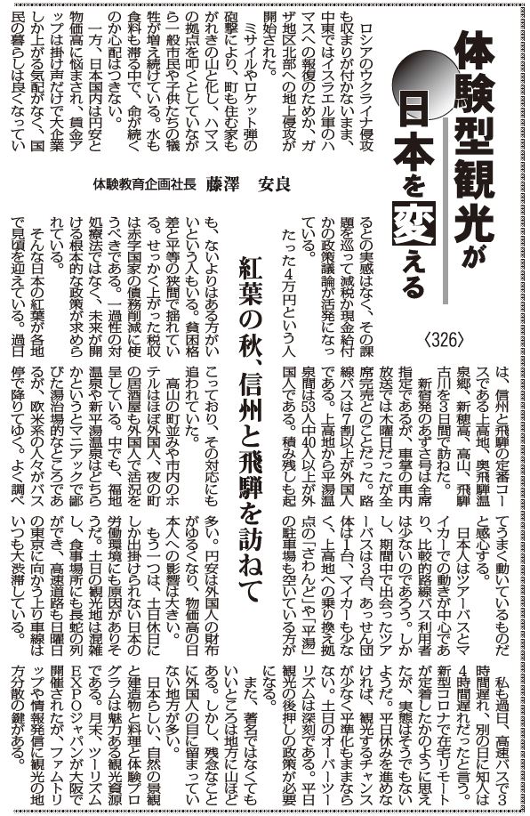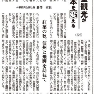 日本らしい、自然の景観と建造物と料理と体験プログラムは魅力ある観光資源である。月末、ツーリズムEXPOジャパンが大阪で開催されたが、ファムトリップや情報発信に観光の地方分散の鍵がある。