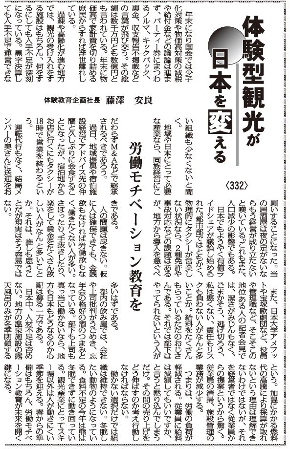 過疎や高齢化が進む地方では、観光の受け入れをする施設はもちろん、何をするにしても人手不足が深刻になっている。黒字決算しても人手不足で運営できない組織も少なくないと聞く。