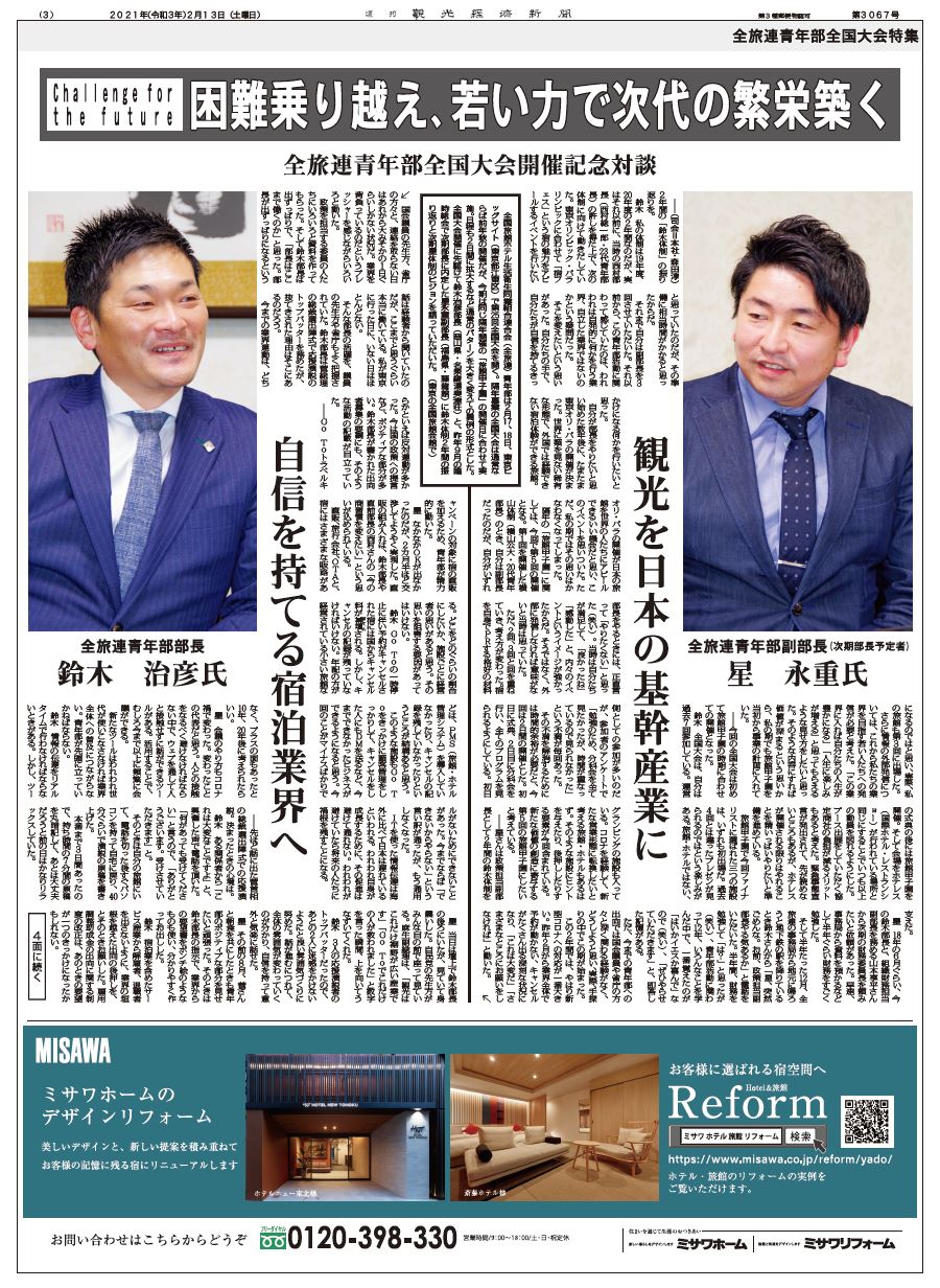 全国旅館ホテル生活衛生同業組合連合会(全旅連)青年部は2月17、18日、東京ビッグサイト(東京都江東区)で第25回全国大会を開く。隔年事業の全国大会は通常ならば前年秋の開催だが、今期は同じ隔年開催の「旅館甲子園」の開催日に合わせて実施。日程も2日間に拡大するなど通常のパターンを大きく変えての異例の形式とした。全国大会開催に先駆けて鈴木治彦部長(岡山県・名泉鍵湯奥津荘)と、昨年9月の臨時総会で次期部長に内定した星永重副部長(福島県・藤龍館)に鈴木体制2年間の振り返りと次期星体制のビジョンを語っていただいた。(東京の全国旅館会館で)